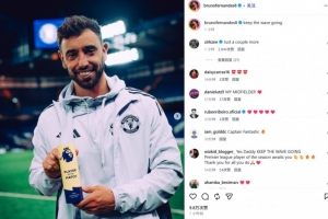B费也在赛后通过社媒晒出自己手捧英超官方全场MVP奖杯的照片,并配文:“继续保持当前的势头!”